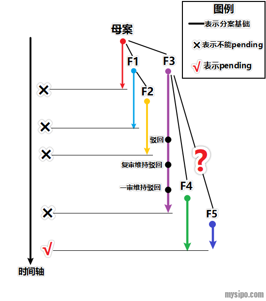 - 深蓝色箭头对应的第五分案享受了第四分案处于pending带来的分案时机;