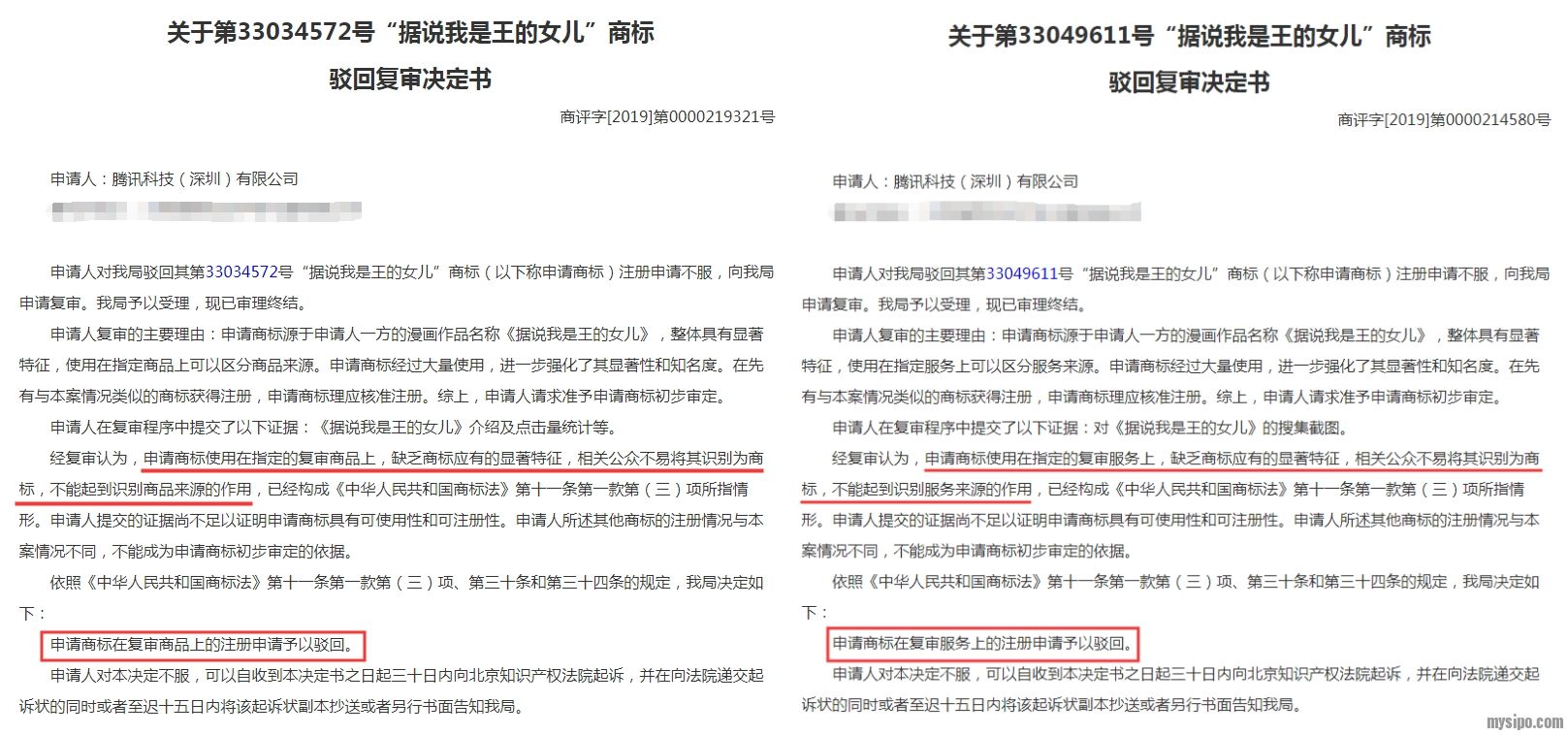 简单的说,腾讯注册的这两件“据说我是王的女儿”商标是因为缺乏商标应有的显著特征,而被商评委驳回其复审申请。