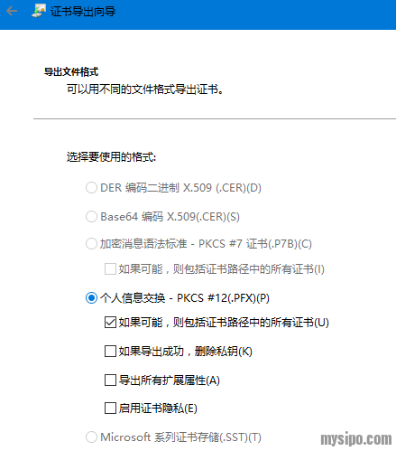 如果第一次导出电子证书的时候,没有选择导出私钥,二次导出时无法再导出成pfx格式的文件,导出的其他格式的电子证书文件也无法正常使用。