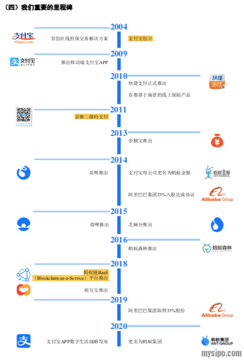 蚂蚁集团起步于2004年支付宝,2011年首推二维码支付,2015年芝麻分推出、2016年蚂蚁森林推出、2018年蚂蚁链平台推出。