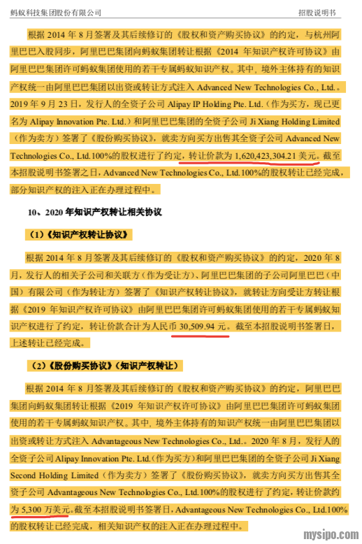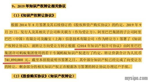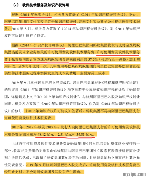 但在蚂蚁集团招股说明书中披露的是蚂蚁集团与阿里巴巴集团之间有知识产权许可协议和知识产权转让协议,关键点是两项协议均为蚂蚁集团向阿里巴巴集团支付费用。