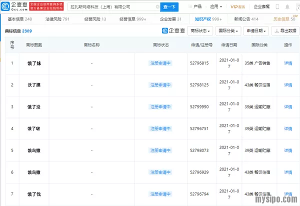 还有饿了么经营主体拉扎斯网络科技(上海)有限公司也于近日新增了多项商标申请信息。这些商标包括“饿了伐”、“饿了妹”、“饿了啵”、“饿鸟撒”、“沃了摸”等,国际分类涉及广告销售、餐饮住宿、运输贮藏、餐饮住宿等,商标状态均为“注册申请中”。