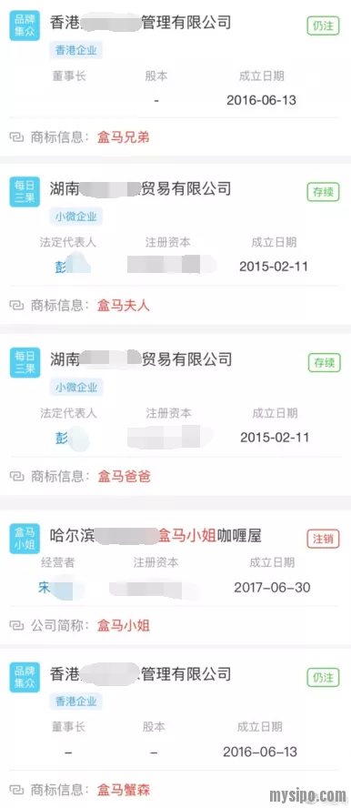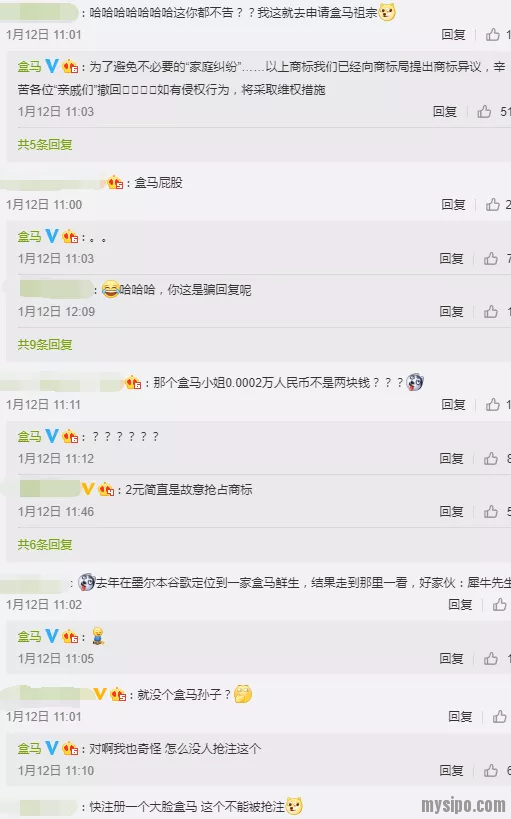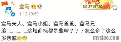12日,盒马鲜生官方微博吐槽商标被抢注,称家里突然多了一堆亲戚,其中包含盒马夫人、盒马小姐、盒马爸爸等。