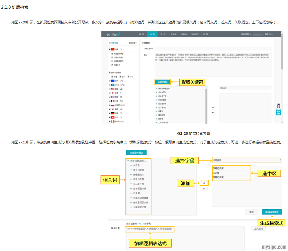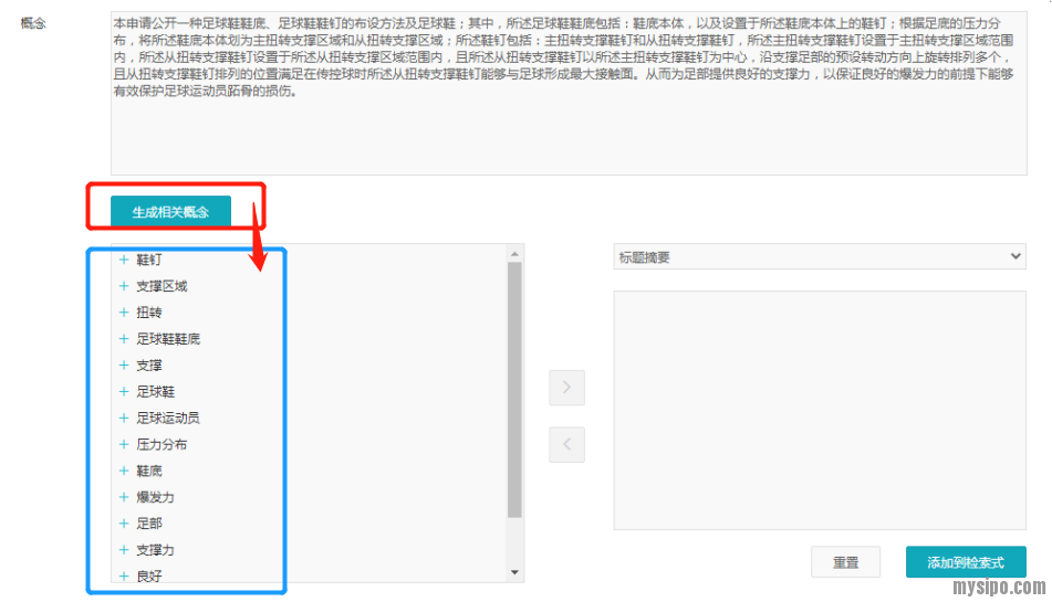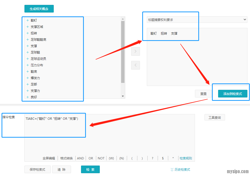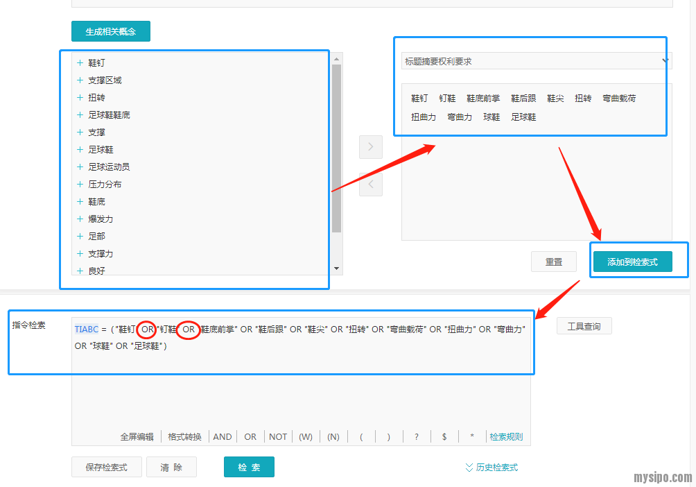 既然系统给出了要素,我们就可以从中选择想要用来生成检索式的关键词了。初始要素和展开后的扩展要素都可以选择,选择后会出现在右侧下方区域,而右侧上方区域可以选择待生成检索式的检索文本范围,之后再点击添加到检索式,一个系统生成的检索式就出现了: