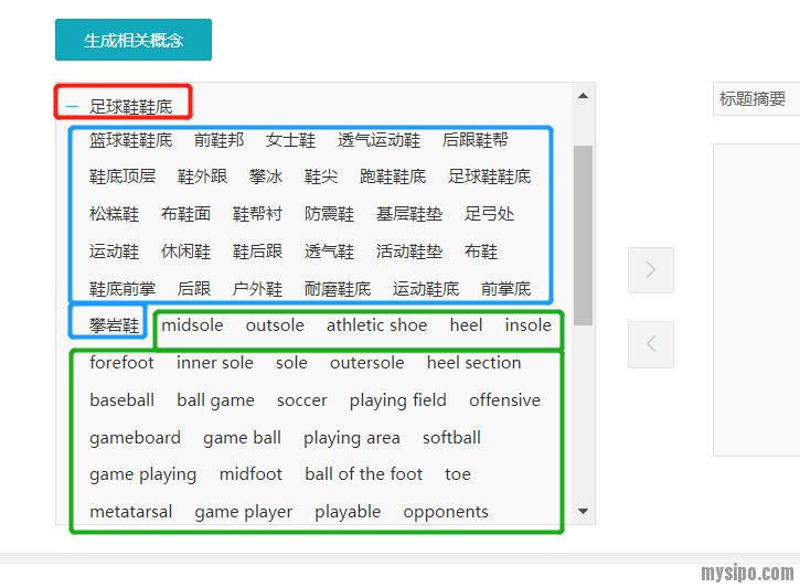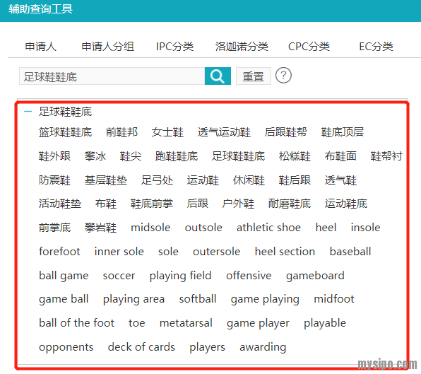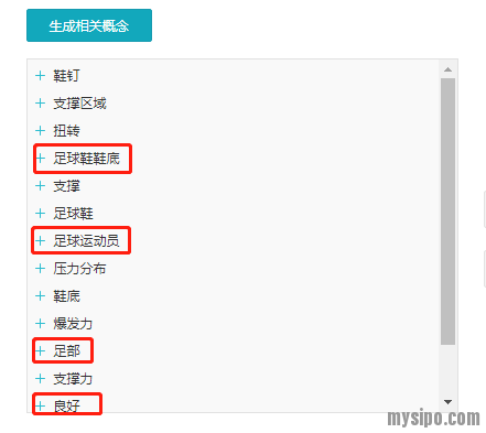 就这个要素来说(本着局部不代表全部的原则),我觉得系统的扩展还是有点尴尬的,至少不那么全面。这样的扩展有点不好选择关键词,但至少从扩展结果来看,系统的确做到把足球鞋和鞋底两个部分拆看进行了扩展,而且还做了英文的扩展,这点值得肯定。而且相对来说,在这个示例中,英文的扩展比中文要准确些。我们如果要选择扩展中的要素时,一定要注意英文的扩展。