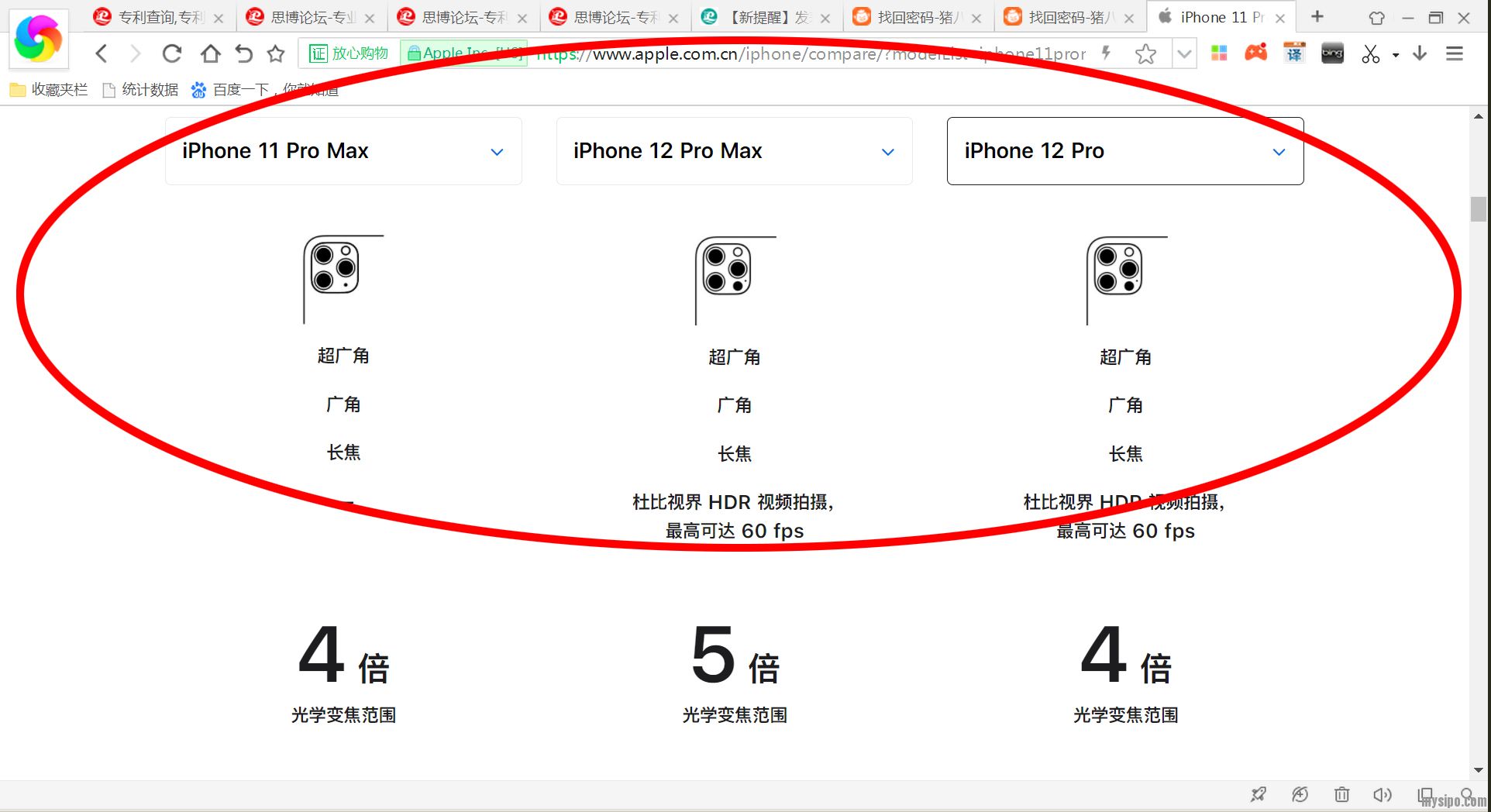 2021.3.25日搜索苹果官网 https://www.apple.com.cn/iphone/compare/?modelList=iphone11promax,iphone12promax,iphone12pro,显示苹果手机有多个型号,背后有三个不同焦距的摄像头, 本专利也有三个摄像头,焦距各不相同。
