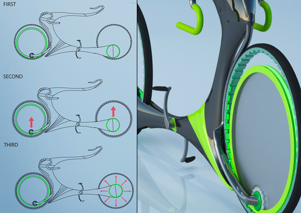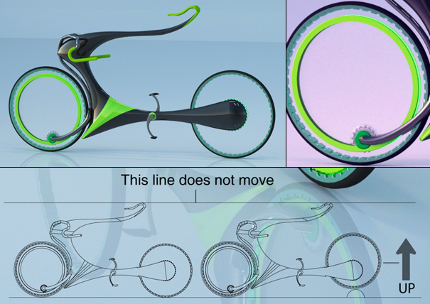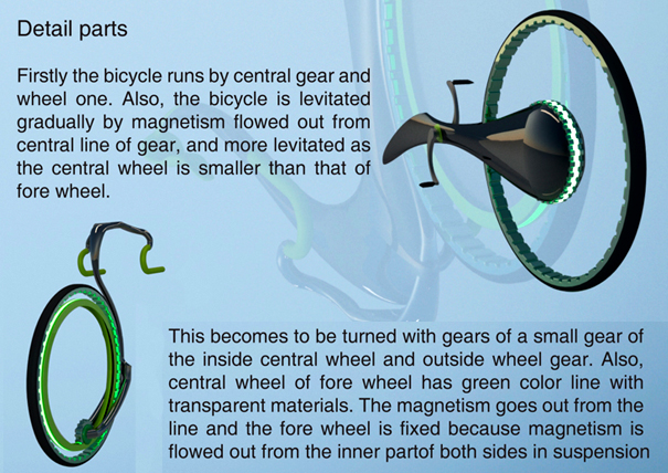 该设计采用了磁悬浮原理,随着车速的提升,后轮的轮轴将会慢慢提升(磁力作用),直到后轮的中点。最神奇的是,当后轮压过石头之类的东西时,轮子的中心位置会自然升高,但是轮轴的位置却并不变化,这样,骑车的人不会感觉到颠簸。