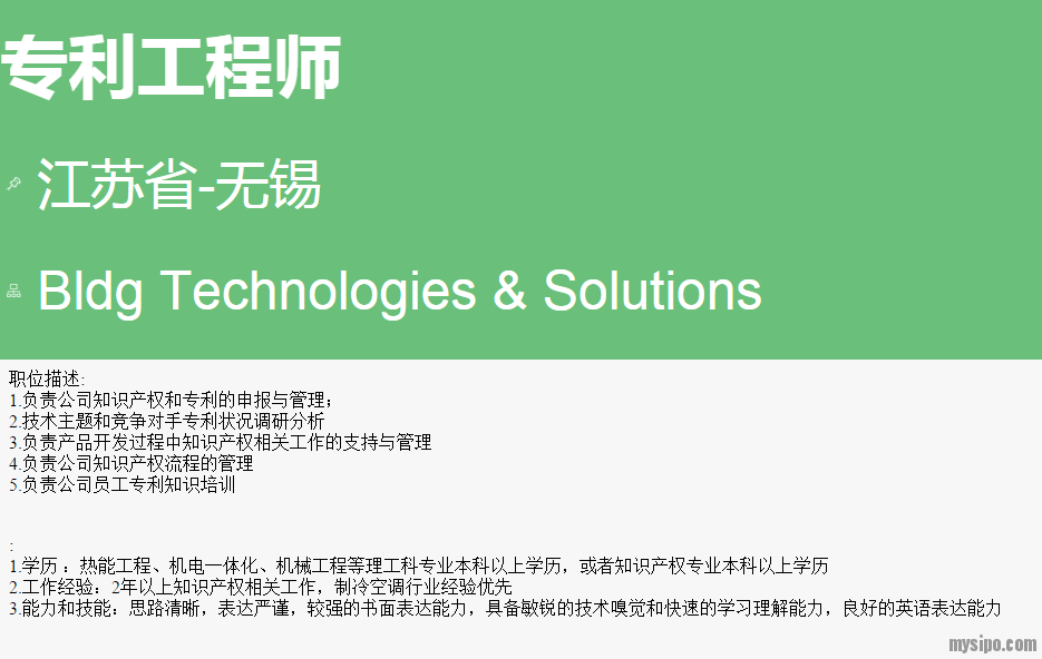 江苏无锡的江森自控招专利工程师,待遇好,有意的可以联系,招到了